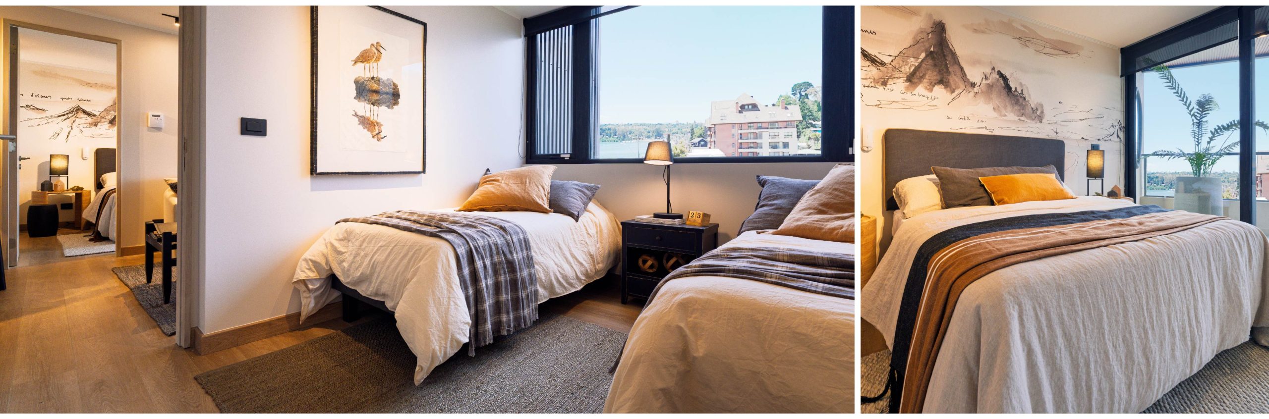 La paleta de colores de Australis Lake Puerto Varas se llena de tonos suaves, arenas, maderas claras y ese blanco tipo Cloud Dancer de Pantone que hace sentir todo más tranquilo y luminoso. Este enfoque cromático también se refleja en los materiales elegidos: cubiertas en tonos piedra, griferías y espejos con acabados sobrios, y porcelanatos que se equilibran con la luz natural del sur.