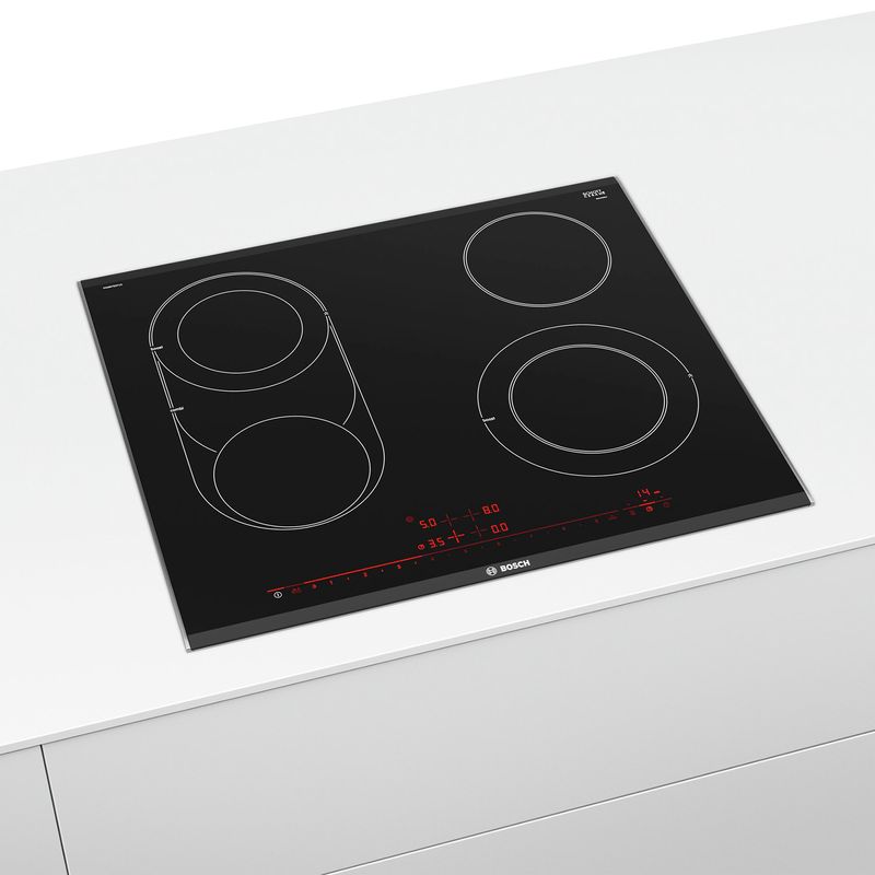 La electrónica DirectSelect Premium de las encimeras Bosch, es de grandes dimensiones ya que cuenta con una longitud total de 30 cm. Para una selección sencilla e intuitiva de los niveles de potencia y las funciones adicionales. Cuando se enciende, se ilumina todo aquello que el usuario puede seleccionar, aunque de una manera más intensa cuando se ha seleccionado alguna de ellas. Cuando la electrónicaestá apagada, el usuario no ve nada: ninguna serigrafía de la electrónica sobre la placa. Únicamente el botón para encender o apagar la placa, lo que contribuye a un diseño limpio y elegante