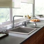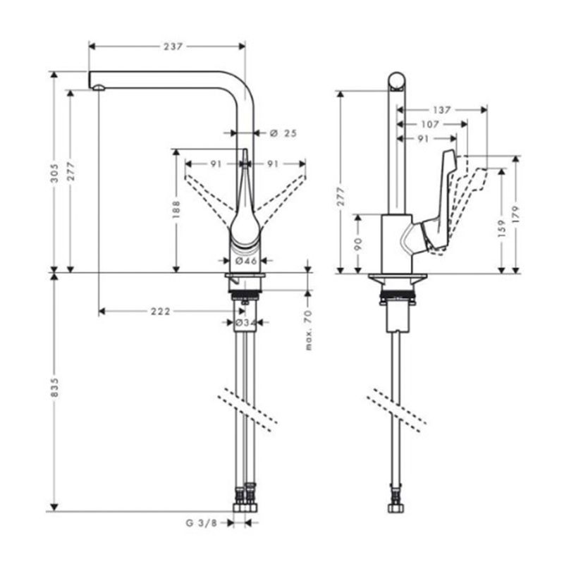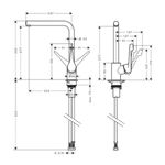 pico en L giratorio con una altura de 277 mm y dos muescas de rotación de 110° y 150°. Fácil montaje: se fija a las mangueras G´, mediante conexiones de tamaño DN15, orificio para Grifería min, 35 mm. Fácil limpieza: la piedra caliza se elimina sin esfuerzo limpiando el espumador del pico (QuickClean).