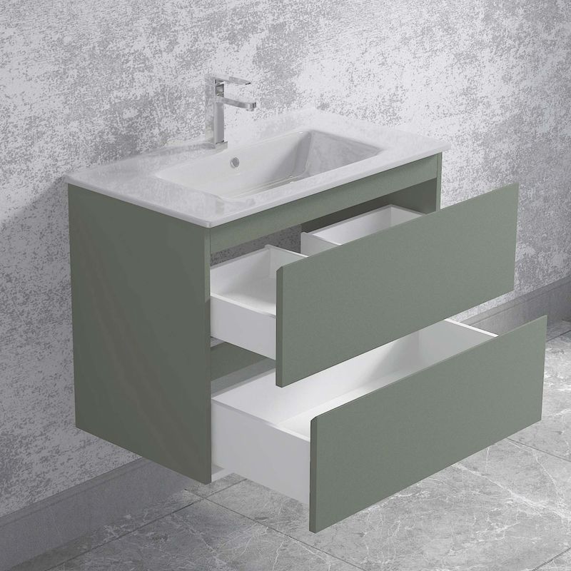Mueble de Baño Albany, es de instalación suspendida, cuenta con dos cajones de apertura soft close. Incluye lavamanos de loza y complementos de instalación.