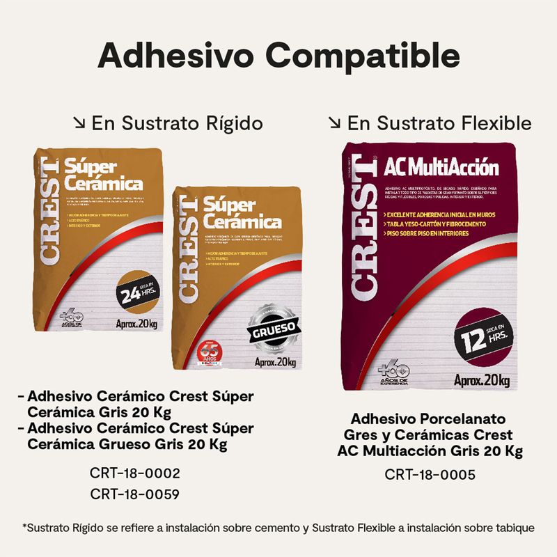 El revestimiento (porcelanato, gres porcelánico y cerámica de piso y muro) están diseñados para ser instalados sobre elementos rígidos tales como: hormigón, muros de albañilería estucados, correctamente nivelados, alineados y aplomados, los pisos deben estar nivelados y en caso de fisuras en losa, estas deben reparar previo a la instalación de revestimientos. No se aconseja, la mezcla