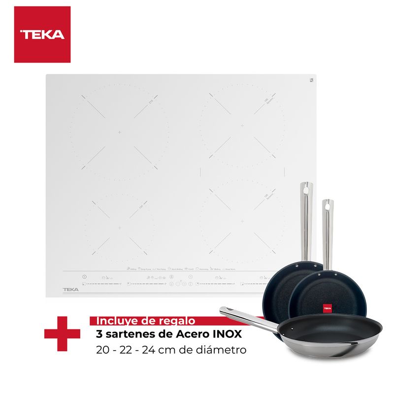Encimera Inducción Cristal Color Blanco (WH), 4 Platos a inducción, Panel Touch Control tipo Multi Slider, Cristal vitrocerámico 4mm., biselado frontal, Sistema de optimización de recipientes, Programación de cada plato, independiente, Funciones Independientes:Función Keep Warm (Mantención de calor) (35°C.), Función Melting (para derretir) (45-55°C.), Función Simmering (Hervir a fuego lento), Función Quick Boiling (Punto de Ebullición), Función Stop & Go (Pausa), Función Grilling (Grillado), Función Pan Frying (Freír con poco aceite), Función Deep Frying, Función Confit, Optimización de recipientes, Función Synchro (2 Platos a la vez) cada uno 185 Ø, Función Power Plus y Stop & Go.